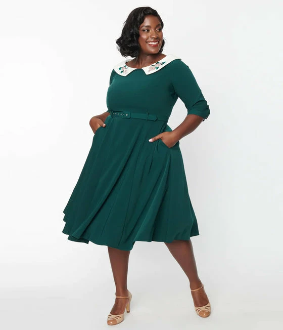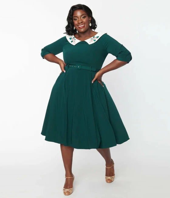 Stroll in style, darlings! The Elle swing dress from Collectif is cast in a stunning emerald green woven fabric. The princess seamed bodice is framed by three-quarter length sleeves. The scoop collar neckline features a lovely floral floral embroidery and is secured by a back zipper and hook. The seamed waist is cinched in with a matching emerald belt as the classic 1950s swing skirt dances around your knees, and has secret hidden pockets in the side seams for a touch of modern sensibilities!