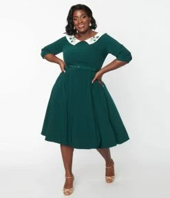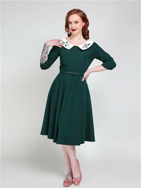 Collectif Elle Swing Dress In Emerald Christmas Embroidered Collar