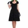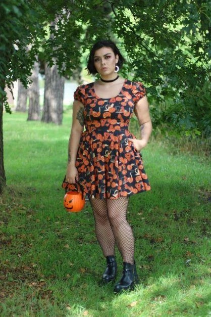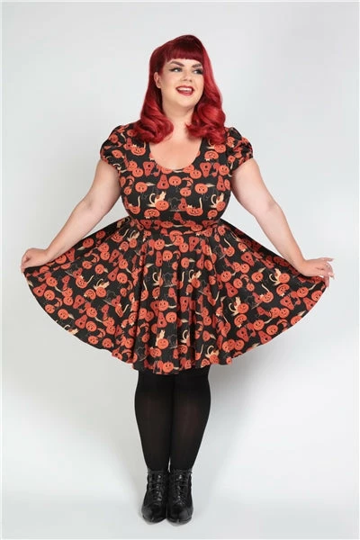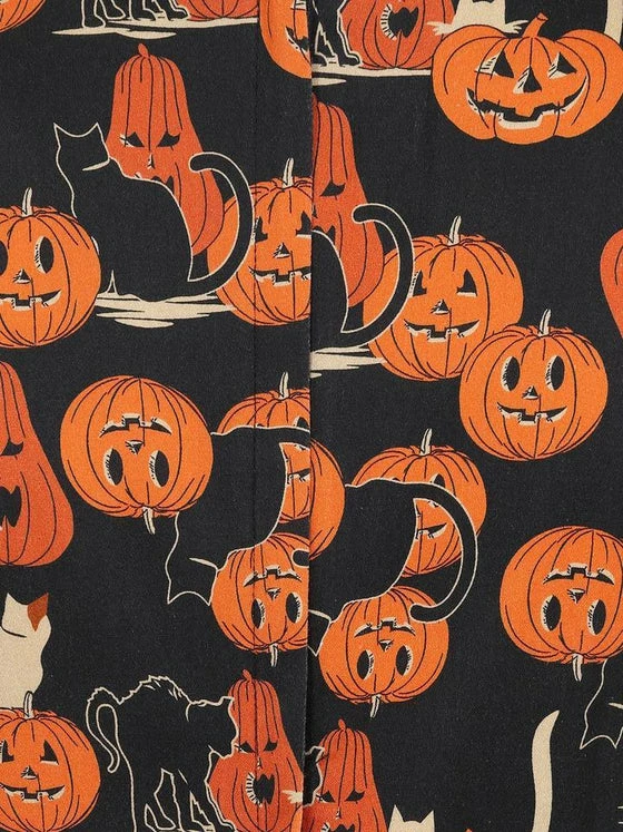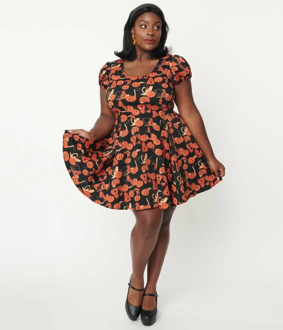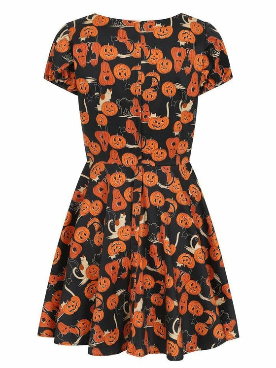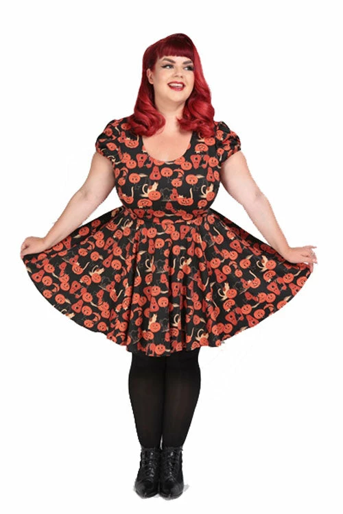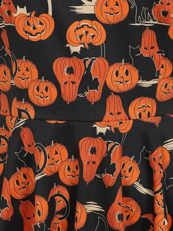 The cutest Halloween dress is here with a Jack O’ Lantern and kitty print on a black background.
