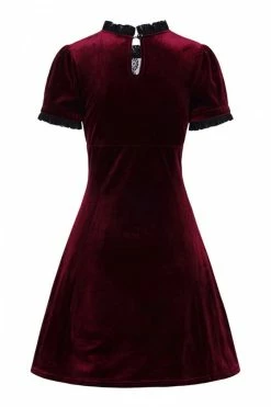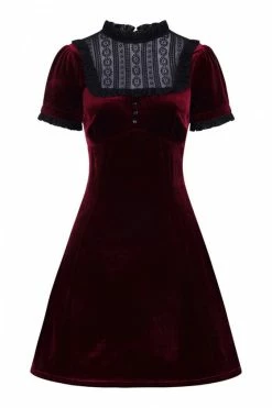 Hell Bunny Caroline Dress Burgundy Velvet With Statement Lace Yolk