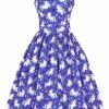 Lady V’s signature Tea dress is cut in a classic ’50’s silhouette, it has a high boat neck, a sleeveless fitted bodice and a cinched waist. A sash ties in a cute bow at the back, adding a playful flourish. Finished in a full, flared hem that ends just above the knee, this is the epitome of vintage glamour. Wear a petticoat underneath to exaggerate its feminine hourglass shape.