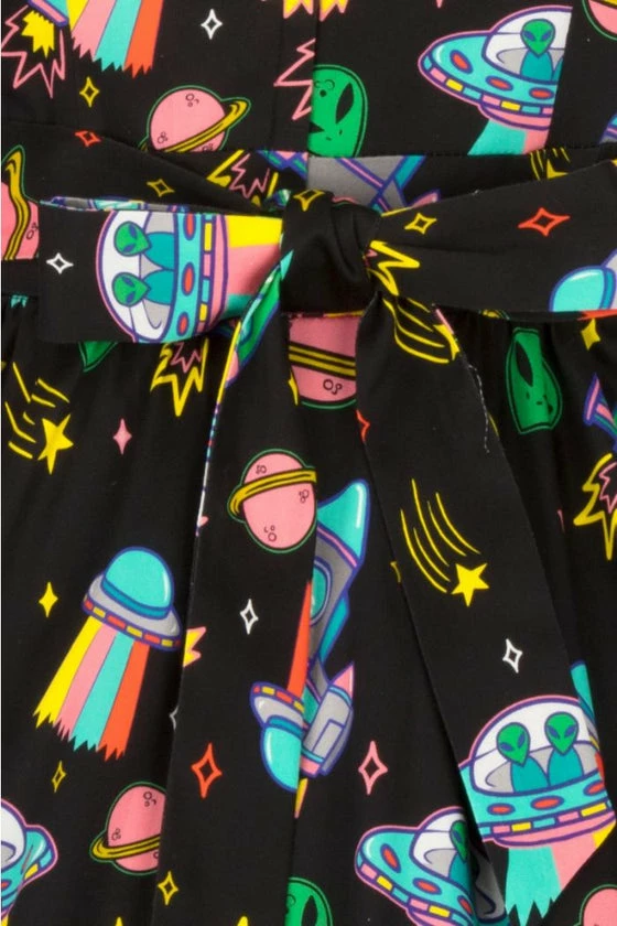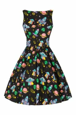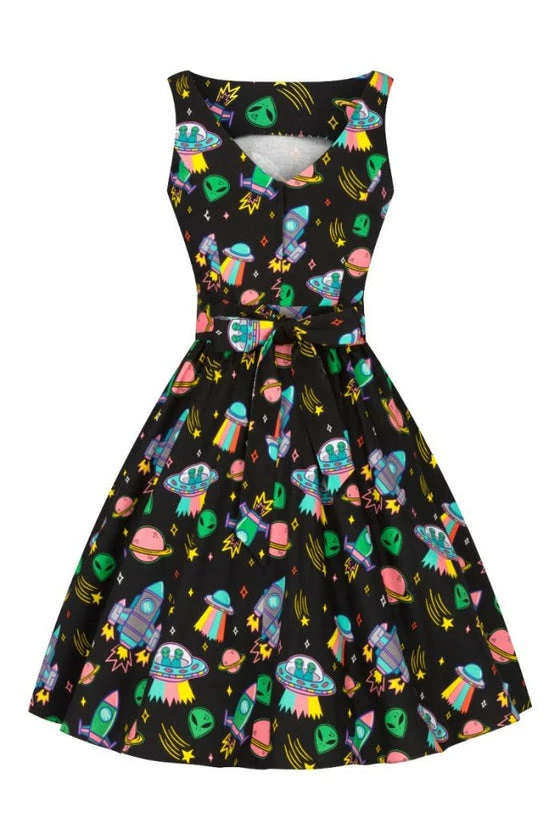 Lady V’s signature Tea dress is cut in a classic ’50’s silhouette, it has a high boat neck, a sleeveless fitted bodice and a cinched waist. A sash ties in a cute bow at the back, adding a playful flourish. Finished in a full, flared hem that ends just above the knee, this is the epitome of vintage glamour. Wear a petticoat underneath to exaggerate its feminine hourglass shape.