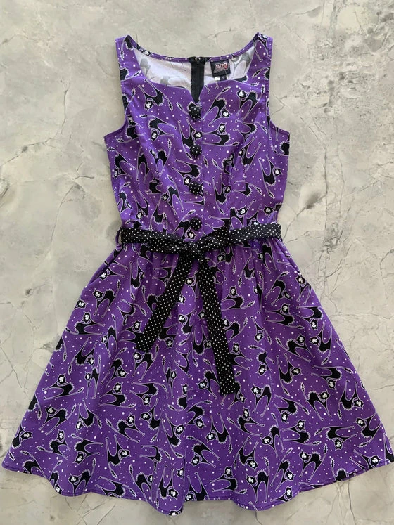 Retrolicious Ida Dress In Scaredy Cat Print Purple And Polkadot